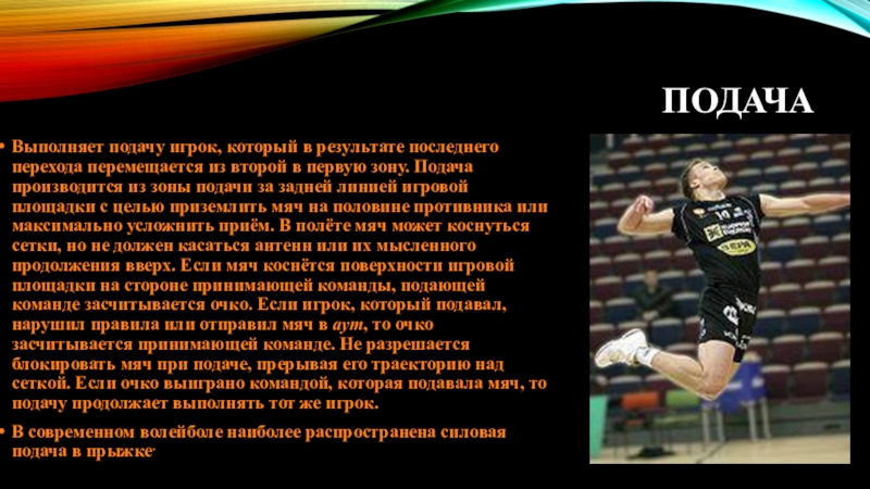 В современном волейболе наиболее распространена силовая подача в прыжке.