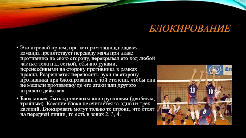 атаке противника на свою сторону, перекрывая его ход любой частью тела над сеткой, обычно руками, перенесёнными на сторону противника в рамках правил. Разрешается переносить руки на сторону противника при блокировании в той степени, чтобы они не мешали противнику до его атаки или другого игрового действия.