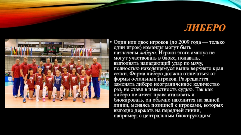 могут быть назначены либеро. Игроки этого амплуа не могут участвовать в блоке, подавать, выполнять нападающий удар по мячу, полностью находящемуся выше верхнего края сетки. Форма либеро должна отличаться от формы остальных игроков. Разрешается заменять либеро неограниченное количество раз, не ставя в известность судью. Так как либеро не имеет права атаковать и блокировать, он обычно находится на задней линии, меняясь позицией с игроками, которых выгодно держать на передней линии, например, с центральным блокирующим.