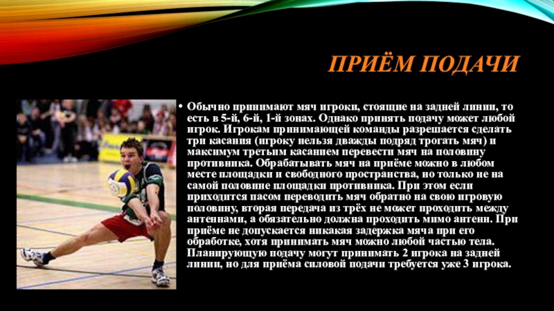 в 5-й, 6-й, 1-й зонах. Однако принять подачу может любой игрок. Игрокам принимающей команды разрешается сделать три касания (игроку нельзя дважды подряд трогать мяч) и максимум третьим касанием перевести мяч на половину противника. Обрабатывать мяч на приёме можно в любом месте площадки и свободного пространства, но только не на самой половине площадки противника. При этом если приходится пасом переводить мяч обратно на свою игровую половину, вторая передача из трёх не может проходить между антеннами, а обязательно должна проходить мимо антенн. При приёме не допускается никакая задержка мяча при его обработке, хотя принимать мяч можно любой частью тела. Планирующую подачу могут принимать 2 игрока на задней линии, но для приёма силовой подачи требуется уже 3 игрока.
