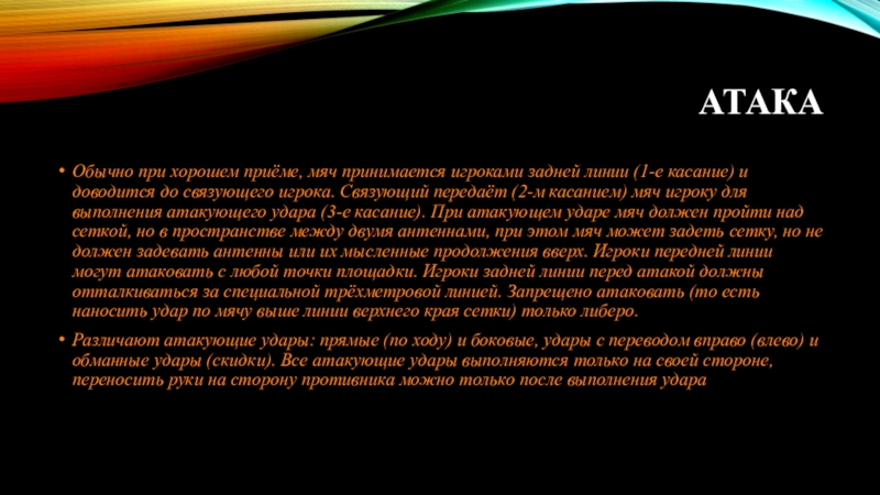 и доводится до связующего игрока. Связующий передаёт (2-м касанием) мяч игроку для выполнения атакующего удара (3-е касание). При атакующем ударе мяч должен пройти над сеткой, но в пространстве между двумя антеннами, при этом мяч может задеть сетку, но не должен задевать антенны или их мысленные продолжения вверх. Игроки передней линии могут атаковать с любой точки площадки. Игроки задней линии перед атакой должны отталкиваться за специальной трёхметровой линией. Запрещено атаковать (то есть наносить удар по мячу выше линии верхнего края сетки) только либеро.