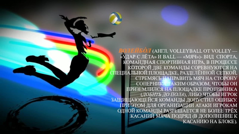 Слайд 2Волейбо́л (англ. Volleyball от volley — «удар с лёта» и ball — «мяч»)- ВИд спорта, командная