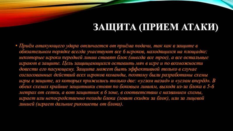 в защите в обязательном порядке всегда участвуют все 6 игроков, находящихся на площадке; некоторые игроки передней линии ставят блок (иногда все трое), а все остальные играют в защите. Цель защищающихся оставить мяч в игре и по возможности довести его пасующему. Защита может быть эффективной только в случае согласованных действий всех игроков команды, поэтому были разработаны схемы игры в защите, из которых прижились только две: «углом назад» и «углом вперёд». В обеих схемах крайние защитники стоят по боковым линиям, выходя из-за блока в 5-6 метрах от сетки, а вот защитник в 6 зоне, в соответствии с названием схемы, играет или непосредственно позади блока (ловит скидки за блок), или за лицевой линией (играет дальние рикошеты от блока).