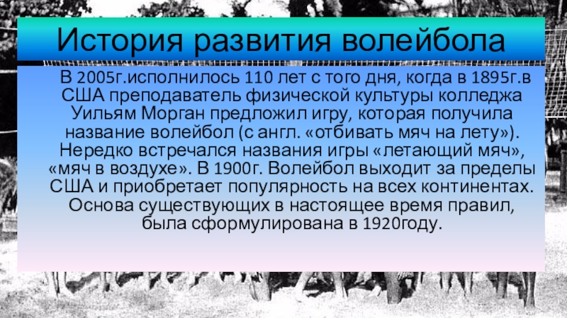 1895г.в США преподаватель физической культуры колледжа Уильям Морган предложил игру, которая получила название волейбол (с англ. «отбивать мяч на лету»). Нередко встречался названия игры «летающий мяч», «мяч в воздухе». В 1900г. Волейбол выходит за пределы США и приобретает популярность на всех континентах. Основа существующих в настоящее время правил, была сформулирована в 1920году.