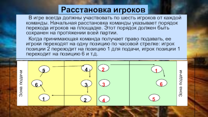 Когда принимающая команда получает право подавать, ее игроки переходят на одну позицию по часовой стрелке: игрок позиции 2 переходит на позицию 1 для подачи, игрок позиции 1 переходит на позицию 6 и т.д.