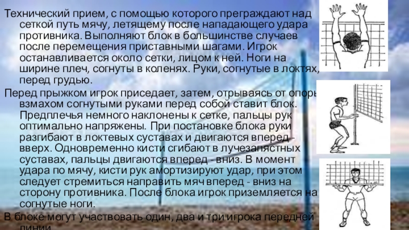 Слайд 19Технический прием, с помощью которого преграждают над сеткой путь мячу, летящему