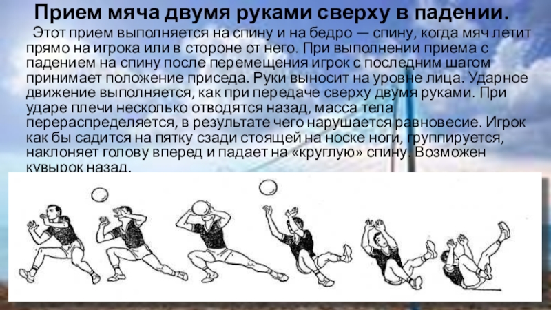 спину и на бедро — спину, когда мяч летит прямо на игрока или в стороне от него. При выполнении приема с падением на спину после перемещения игрок с последним шагом принимает положение приседа. Руки выносит на уровне лица. Ударное движение выполняется, как при передаче сверху двумя руками. При ударе плечи несколько отводятся назад, масса тела перераспределяется, в результате чего нарушается равновесие. Игрок как бы садится на пятку сзади стоящей на носке ноги, группируется, наклоняет голову вперед и падает на «круглую» спину. Возможен кувырок назад.