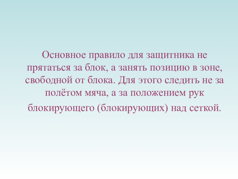 Слайд 18Основное правило для защитника не прятаться за блок, а занять позицию