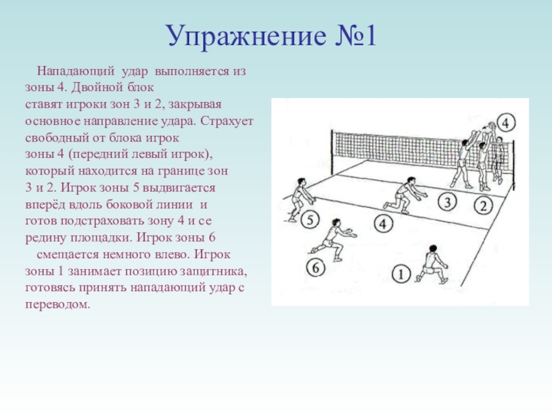смещается немного влево. Игрок зоны 1 занимает позицию защитника, готовясь принять нападающий удар с переводом.