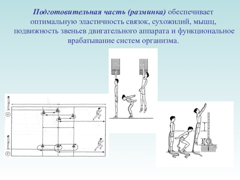 Слайд 6Подготовительная часть (разминка) обеспечивает оптимальную эластичность связок, сухожилий, мышц, подвижность звеньев
