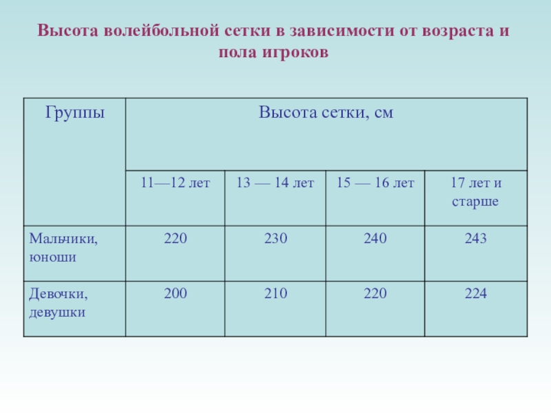 Слайд 4Высота волейбольной сетки в зависимости от возраста и пола игроков