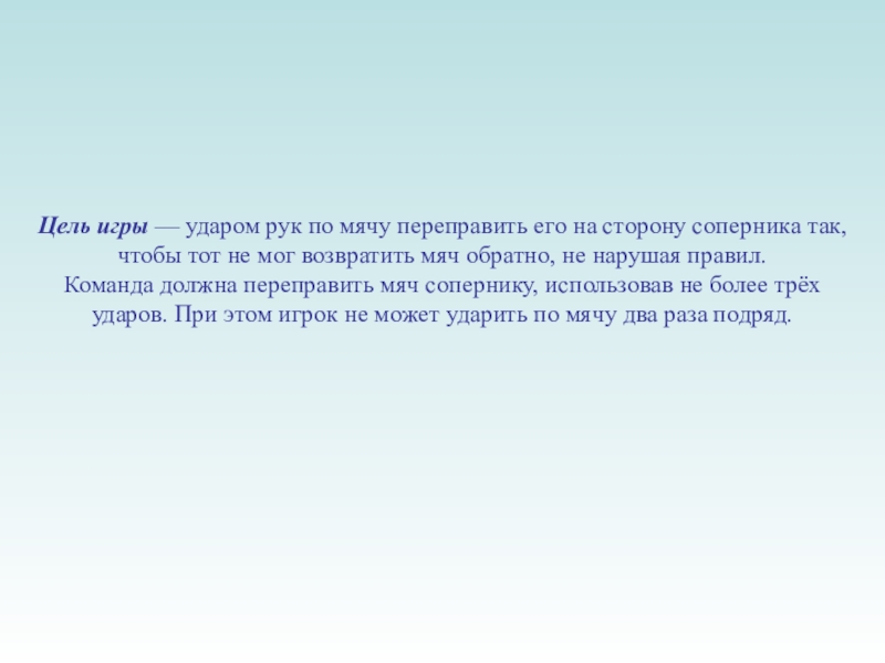 Команда должна переправить мяч сопернику, использовав не более трёх ударов. При этом игрок не может ударить по мячу два раза подряд.