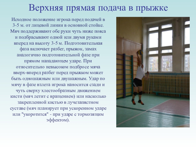 м. от лицевой линии в основной стойке. Мяч поддерживают обе руки чуть ниже пояса и подбрасывают одной или двумя руками вперед на высоту 3-5 м. Подготовительная фаза включает разбег, прыжок, замах аналогично подготовительной фазе при прямом нападающем ударе. При относительно невысоком подбросе мяча вверх-вперед разбег перед прыжком может быть одношажным или двушажным. Удар по мячу в фазе взлета игрока наносится сзади и чуть сверху хлестообразным движением кисти (мяч летит с вращением) или насколько закрепленной кистью в лучезапястном суставе (мяч планирует при ускоренном ударе или "укоротится" - при ударе с тормозящим эффектом).