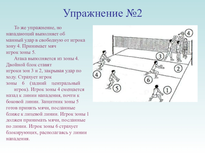 игрок). Игрок зоны 4 смещается назад к линии нападения, почти к боковой линии. Защитник зоны 5 готов принять мячи, посланные ближе к лицевой линии. Игрок зоны 1 должен принимать мячи, посланные по линии. Игрок зоны 6 страхует блокирующих, располагаясь у линии нападения.