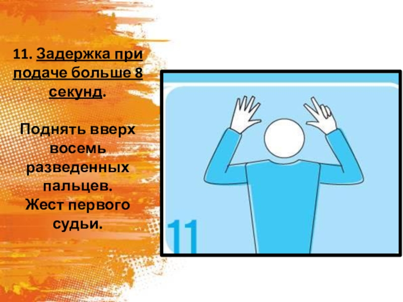 11. Задержка при подаче больше 8 секунд.  Поднять вверх восемь разведенных пальцев. Жест первого судьи.