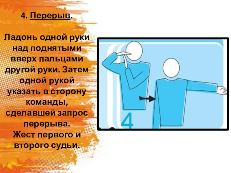 одной рукой указать в сторону команды, сделавшей запрос перерыва. Жест первого и второго судьи.
