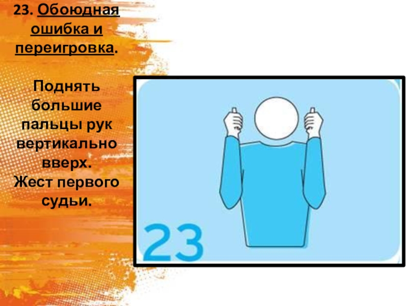 23. Обоюдная ошибка и переигровка.  Поднять большие пальцы рук вертикально вверх. Жест первого судьи.