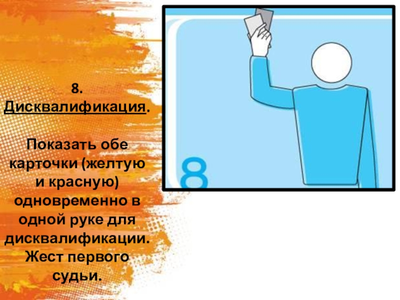 8. Дисквалификация.  Показать обе карточки (желтую и красную) одновременно в одной руке для дисквалификации. Жест первого