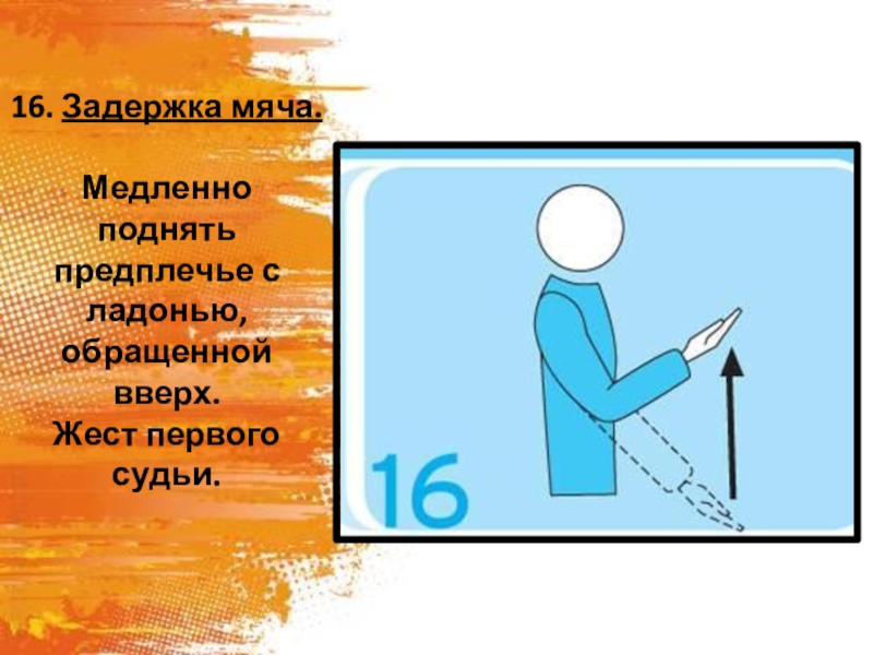 16. Задержка мяча.  Медленно поднять предплечье с ладонью, обращенной вверх. Жест первого судьи.