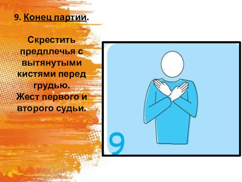 9. Конец партии.  Скрестить предплечья с вытянутыми кистями перед грудью. Жест первого и второго судьи.
