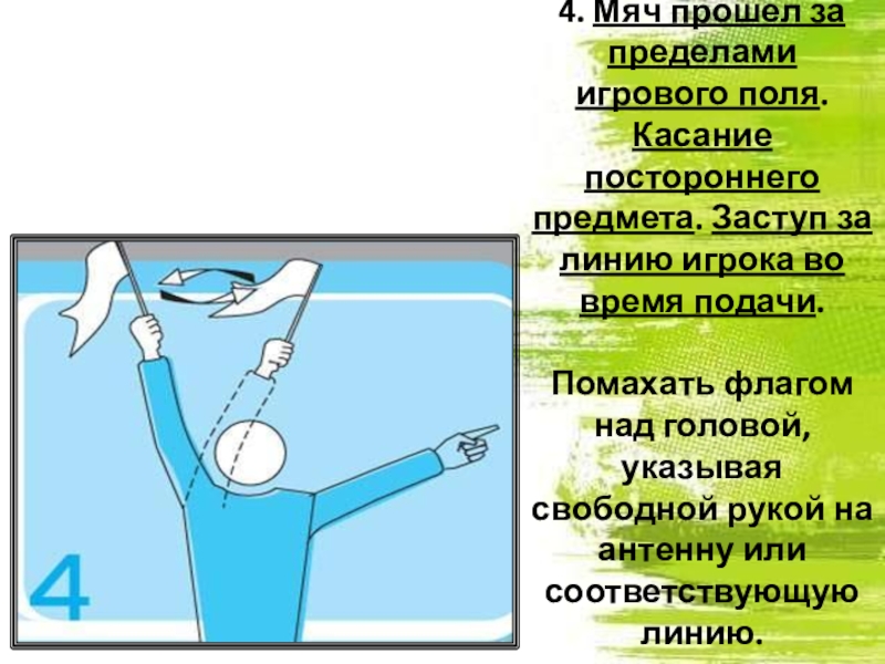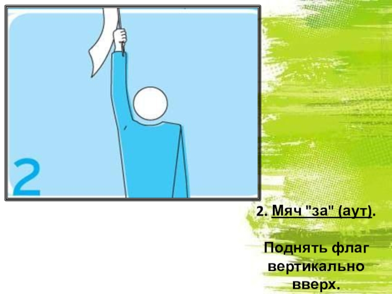 Слайд 332. Мяч "за" (аут). Поднять флаг вертикально вверх.