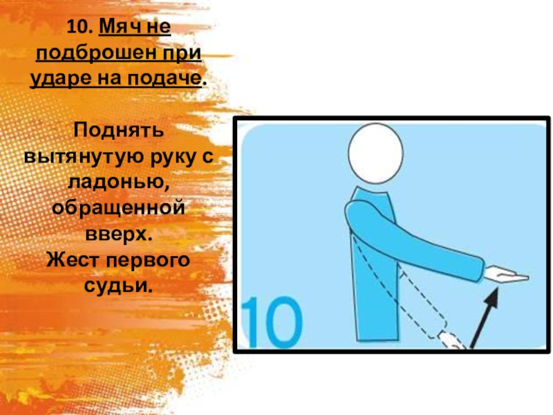10. Мяч не подброшен при ударе на подаче.  Поднять вытянутую руку с ладонью, обращенной вверх. Жест