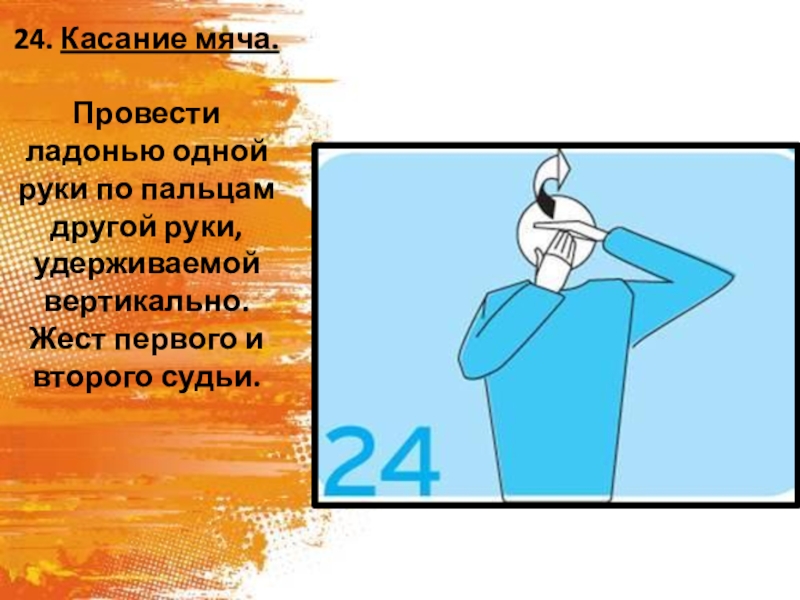 24. Касание мяча.  Провести ладонью одной руки по пальцам другой руки, удерживаемой вертикально. Жест первого и
