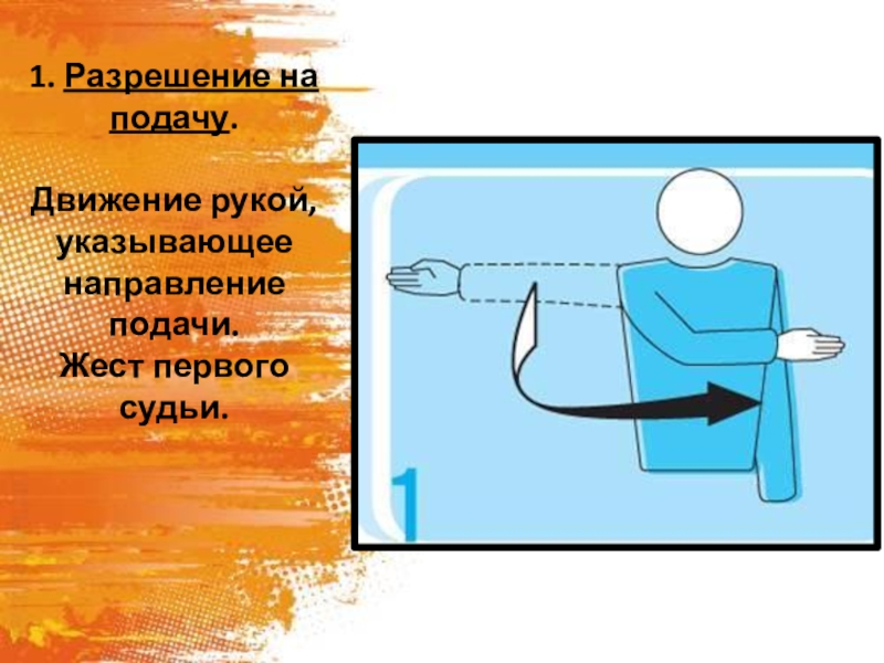 1. Разрешение на подачу.  Движение рукой, указывающее направление подачи. Жест первого судьи.