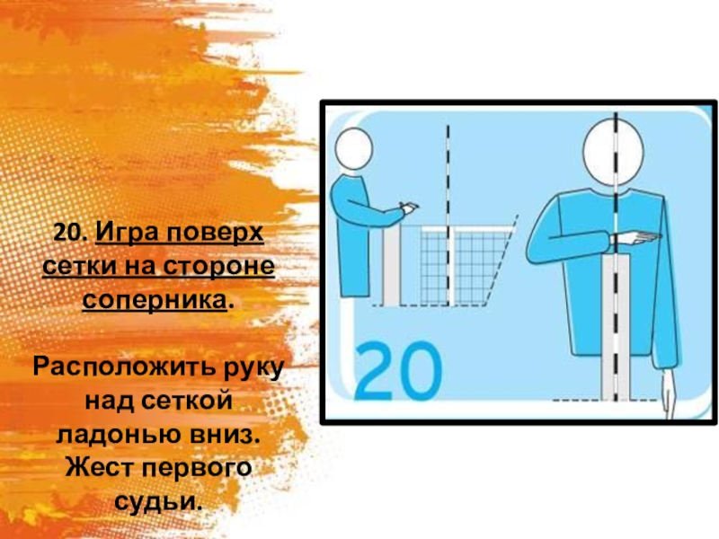 20. Игра поверх сетки на стороне соперника.  Расположить руку над сеткой ладонью вниз. Жест первого судьи.