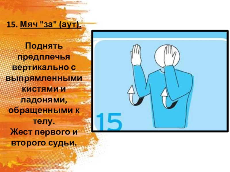 Слайд 2015. Мяч "за" (аут). Поднять предплечья вертикально с выпрямленными кистями и ладонями,