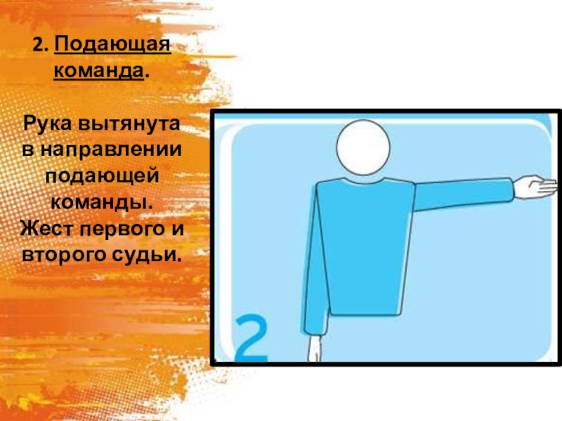 2. Подающая команда.  Рука вытянута в направлении подающей команды. Жест первого и второго судьи.