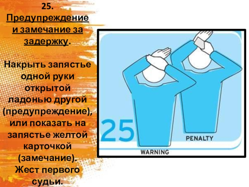 Слайд 2116. Задержка мяча. Медленно поднять предплечье с ладонью, обращенной вверх. Жест первого судьи.