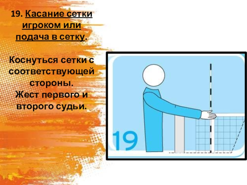 19. Касание сетки игроком или подача в сетку.  Коснуться сетки с соответствующей стороны. Жест первого и