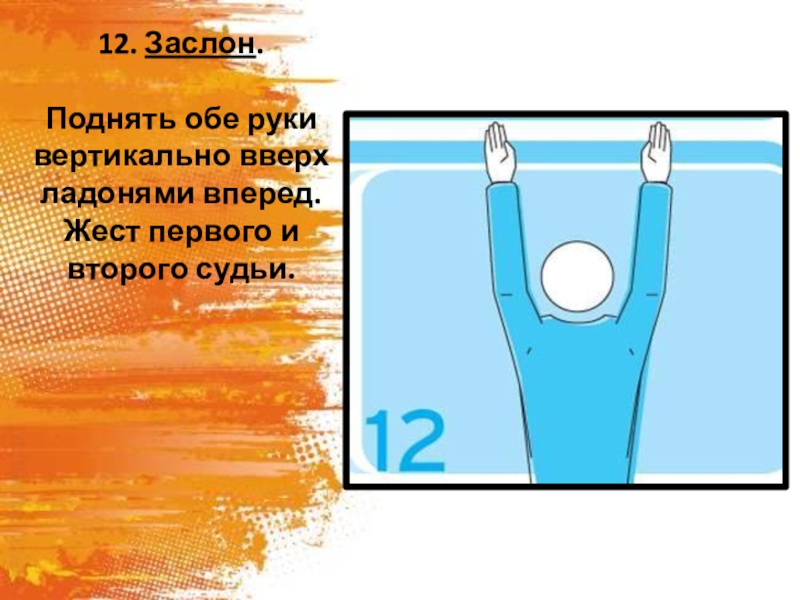 12. Заслон.  Поднять обе руки вертикально вверх ладонями вперед. Жест первого и второго судьи.