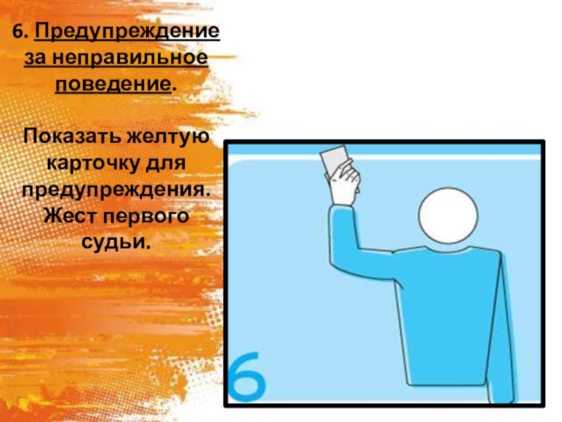 6. Предупреждение за неправильное поведение.  Показать желтую карточку для предупреждения. Жест первого судьи.