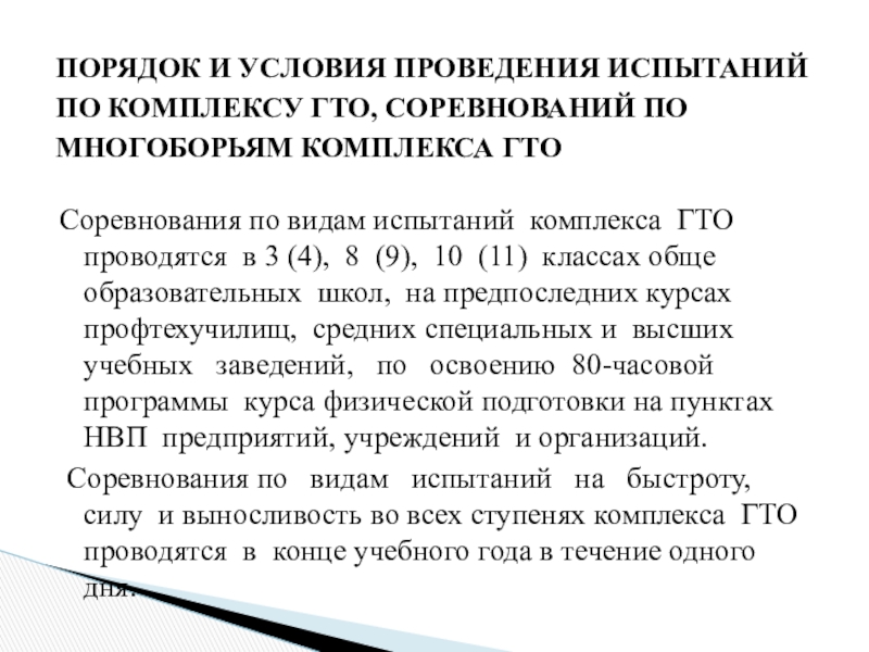 ПОРЯДОК И УСЛОВИЯ ПРОВЕДЕНИЯ ИСПЫТАНИЙ ПО КОМПЛЕКСУ ГТО, СОРЕВНОВАНИЙ ПО МНОГОБОРЬЯМ КОМПЛЕКСА ГТО