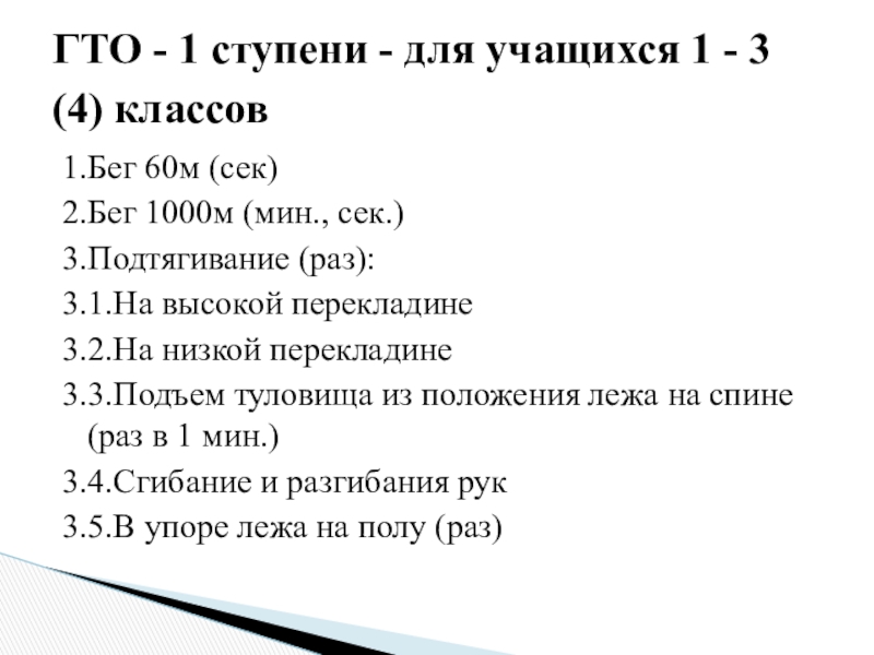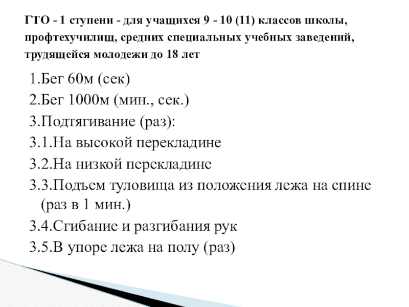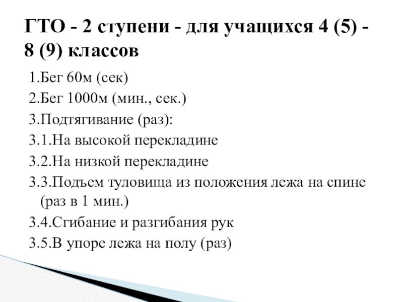 1.Бег 60м (сек)2.Бег 1000м (мин., сек.)3.Подтягивание (раз):3.1.На высокой перекладине3.2.На низкой перекладине3.3.Подъем туловища из положения лежа на спине