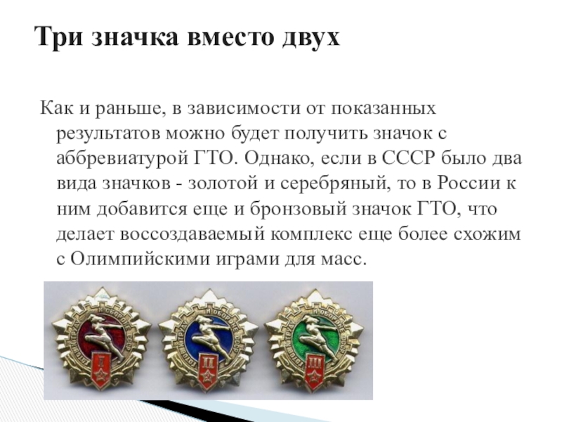 значок с аббревиатурой ГТО. Однако, если в СССР было два вида значков - золотой и серебряный, то в России к ним добавится еще и бронзовый значок ГТО, что делает воссоздаваемый комплекс еще более схожим с Олимпийскими играми для масс.