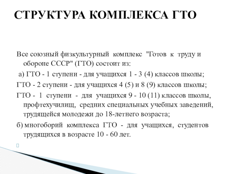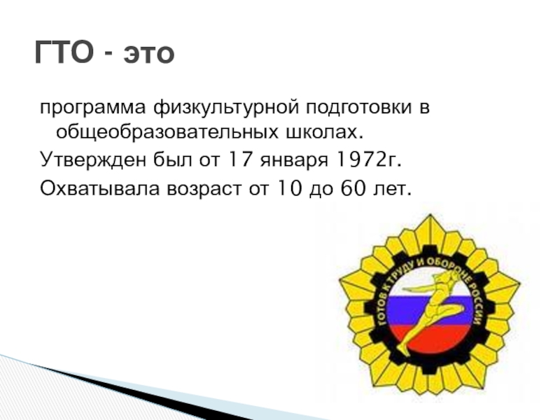 программа физкультурной подготовки в общеобразовательных школах. Утвержден был от 17 января 1972г. Охватывала возраст от 10 до 60 лет. ГТО - это