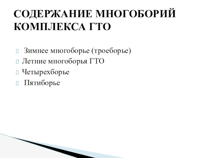 Зимнее многоборье (троеборье) Летние многоборья ГТОЧетырехборье ПятиборьеСОДЕРЖАНИЕ МНОГОБОРИЙ КОМПЛЕКСА ГТО