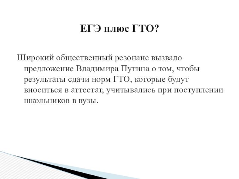 Широкий общественный резонанс вызвало предложение Владимира Путина о том, чтобы результаты сдачи норм ГТО, которые будут вноситься