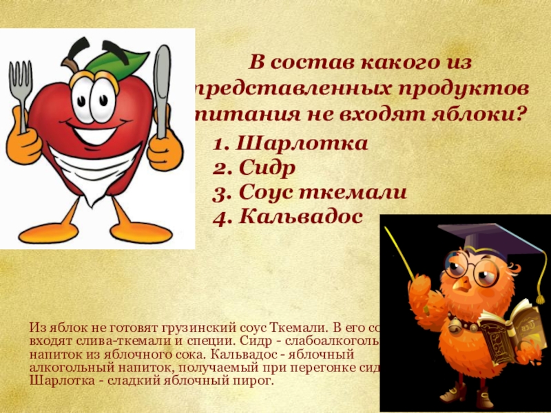 Из яблок не готовят грузинский соус Ткемали. В его состав входят слива-ткемали и специи. Сидр - слабоалкогольный напиток из яблочного сока. Кальвадос - яблочный алкогольный напиток, получаемый при перегонке сидра. Шарлотка - сладкий яблочный пирог.