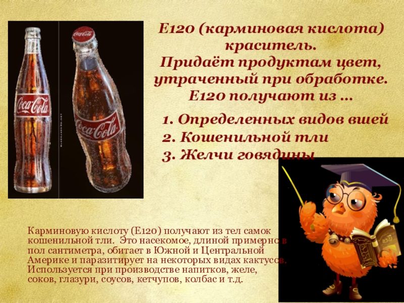 Придаёт продуктам цвет, утраченный при обработке. Е120 получают из …