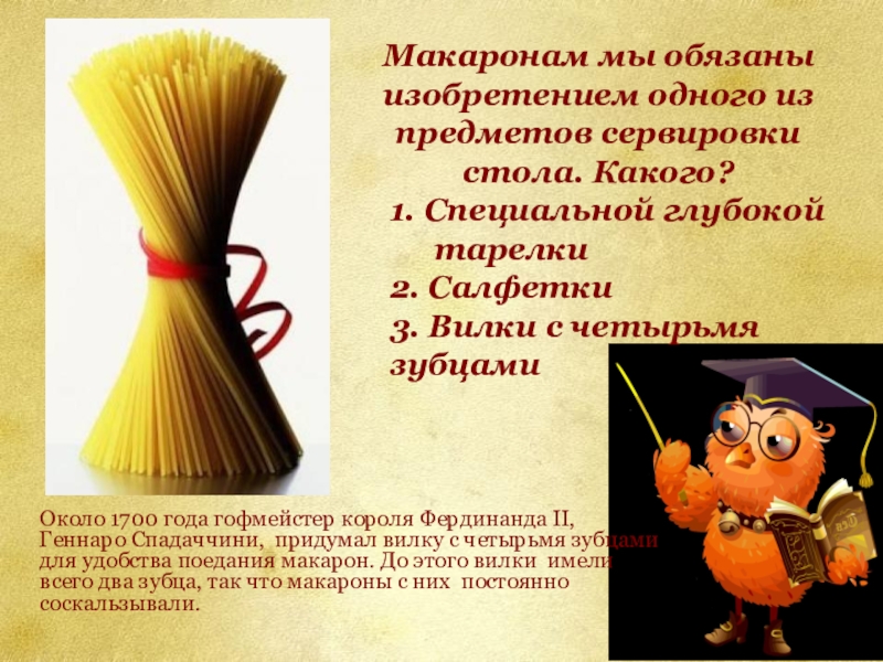 Макаронам мы обязаны изобретением одного из предметов сервировки стола. Какого?