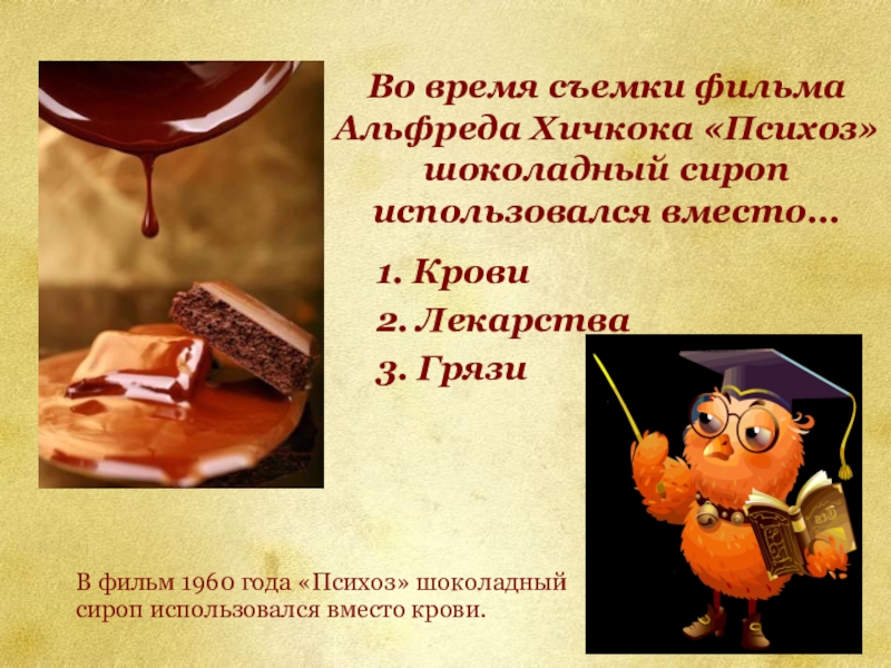 В фильм 1960 года «Психоз» шоколадный сироп использовался вместо крови.