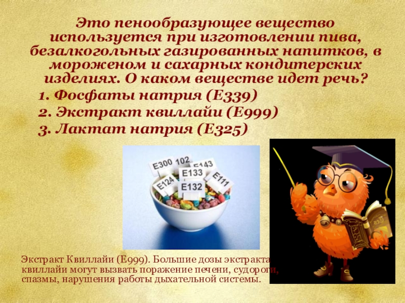 Это пенообразующее вещество используется при изготовлении пива, безалкогольных газированных напитков, в мороженом и сахарных кондитерских изделиях. О каком веществе идет речь?