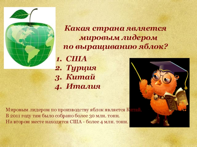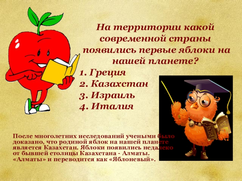 После многолетних исследований учеными было доказано, что родиной яблок на нашей планете является Казахстан. Яблоки появились недалеко от бывшей столицы Казахстана - Алматы. «Алматы» и переводится как «Яблоневый».