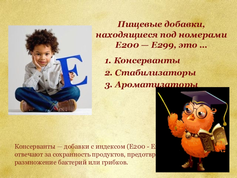 Консерванты — добавки с индексом (E200 - E299) отвечают за сохранность продуктов, предотвращая размножение бактерий или грибков.