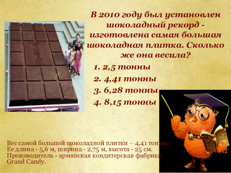 Вес самой большой шоколадной плитки – 4,41 тонны.