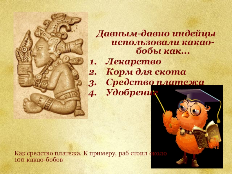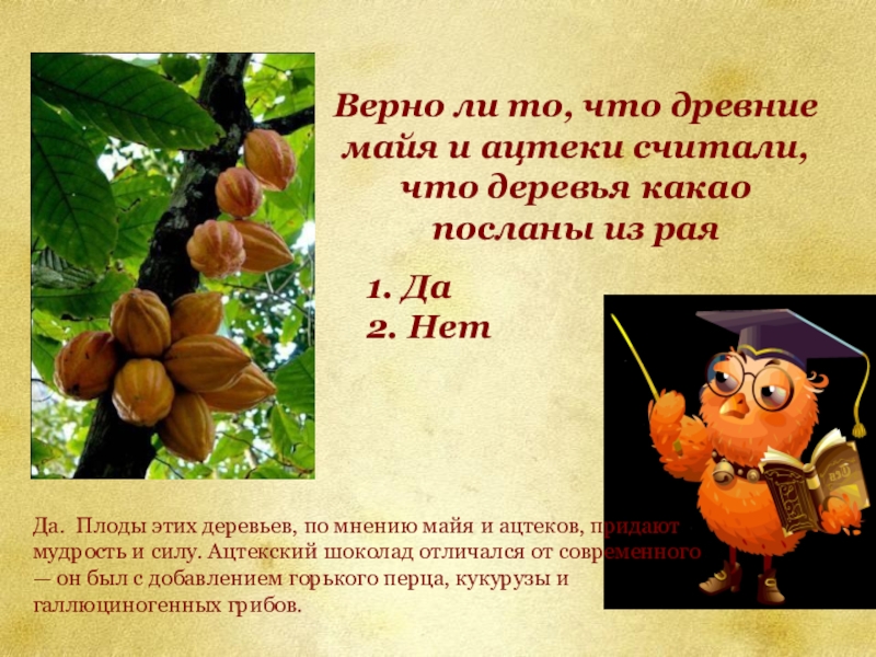 Да. Плоды этих деревьев, по мнению майя и ацтеков, придают мудрость и силу. Ацтекский шоколад отличался от современного — он был с добавлением горького перца, кукурузы и галлюциногенных грибов.